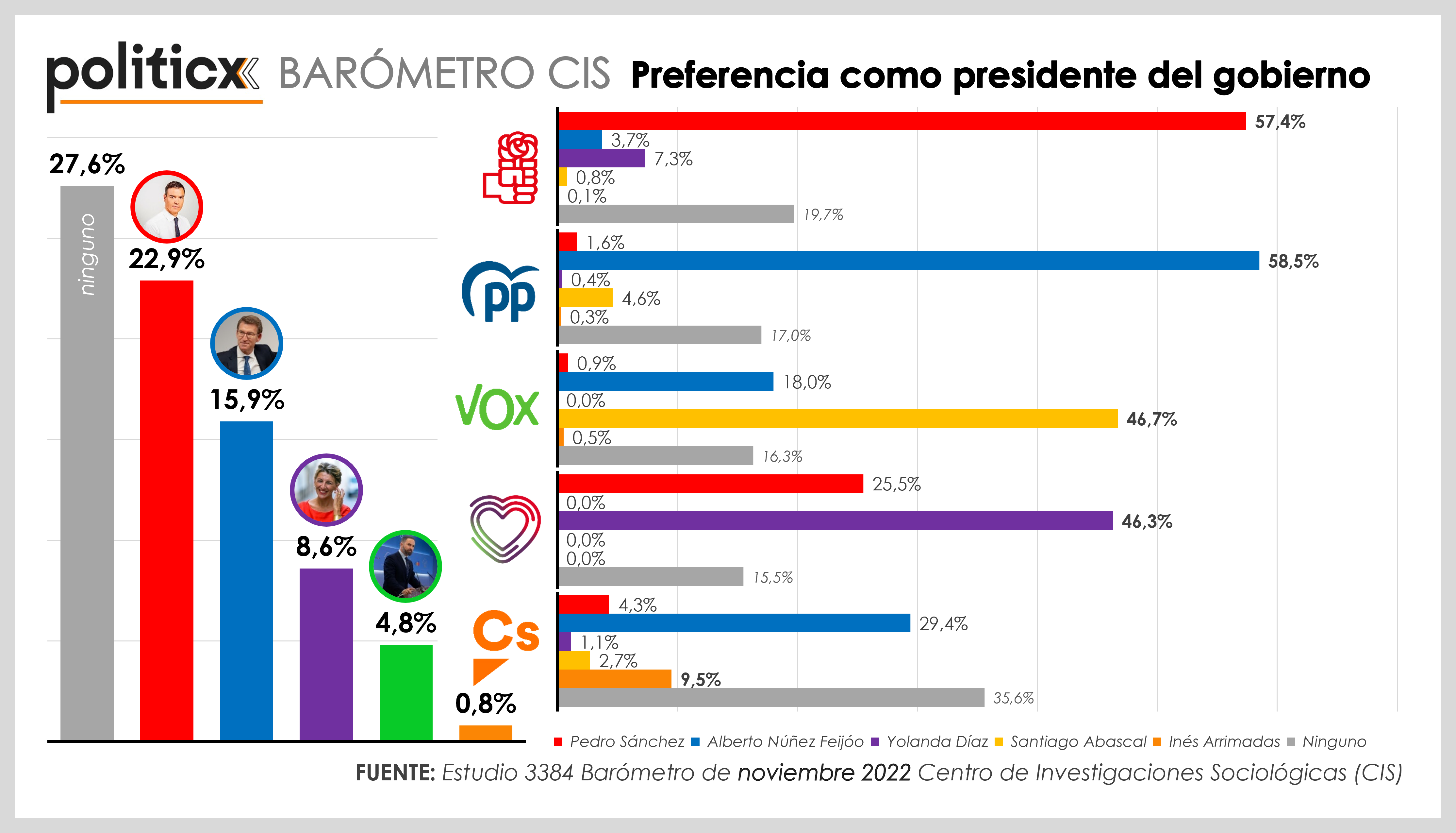 Sánchez sigue siendo el político que mayor preferencia presenta por parte de los encuestados para ser presidente del Gobierno manteniendo el mismo 22,9% que hace un mes y seguido igualmente de Feijóo (15,9%), que baja 1,5 puntos (17,4% en octubre). Aun así, la opción más repetida es el no preferir a ninguno de los líderes actuales (26,8%), preferencia que sigue creciendo hasta el 26,8% (+0,8 puntos desde octubre).