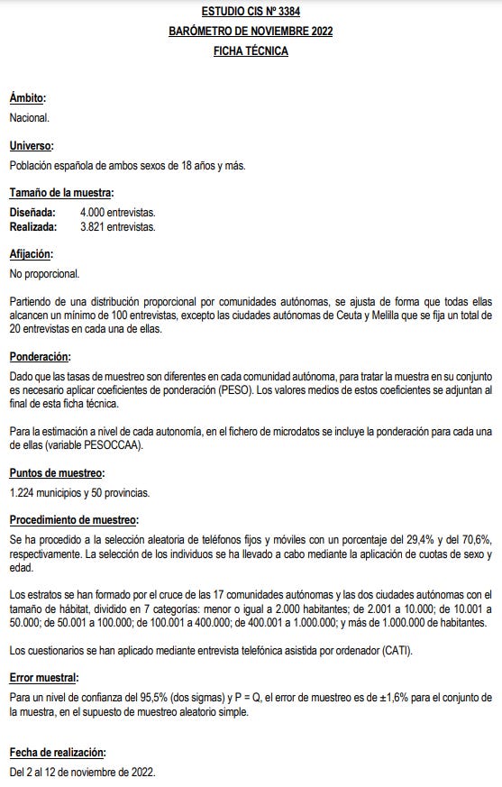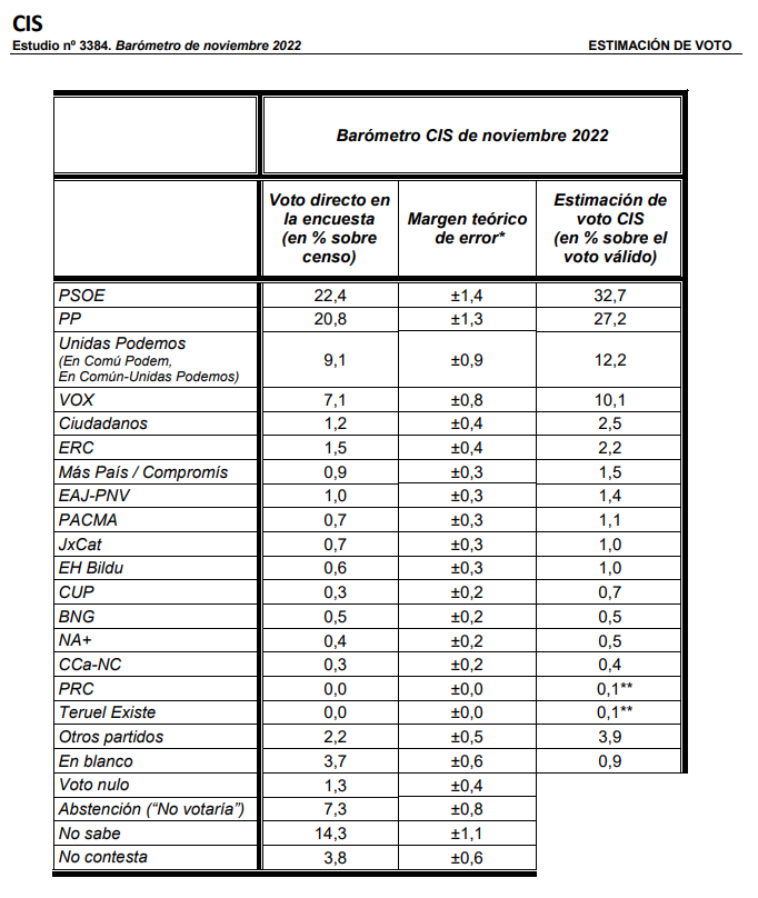 Avance de resultados: Estudio 3388 CIS noviembre 2022.