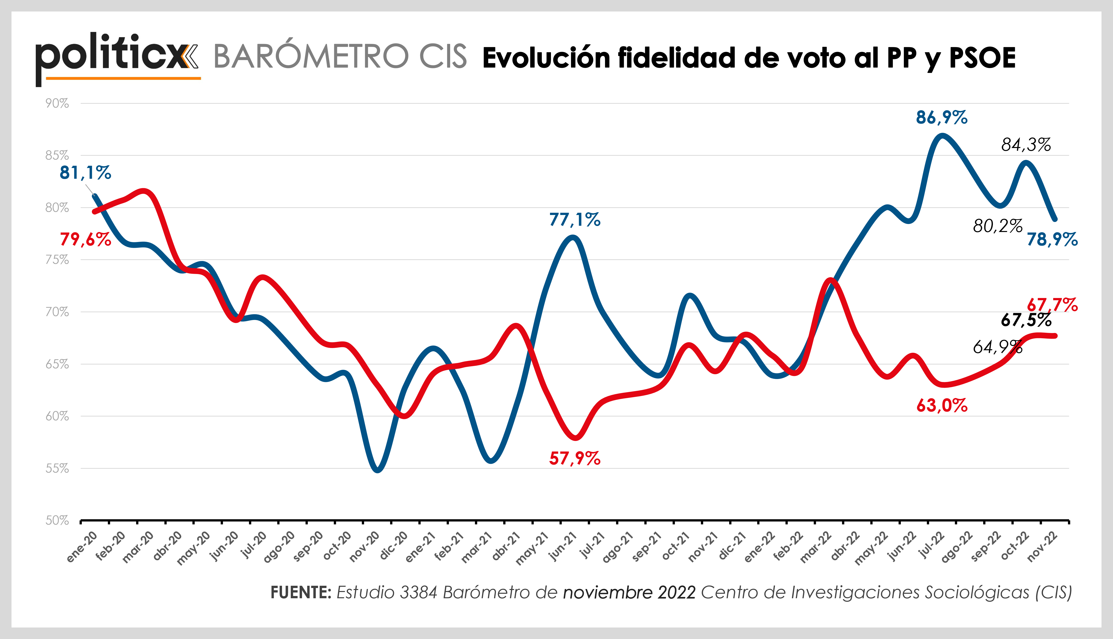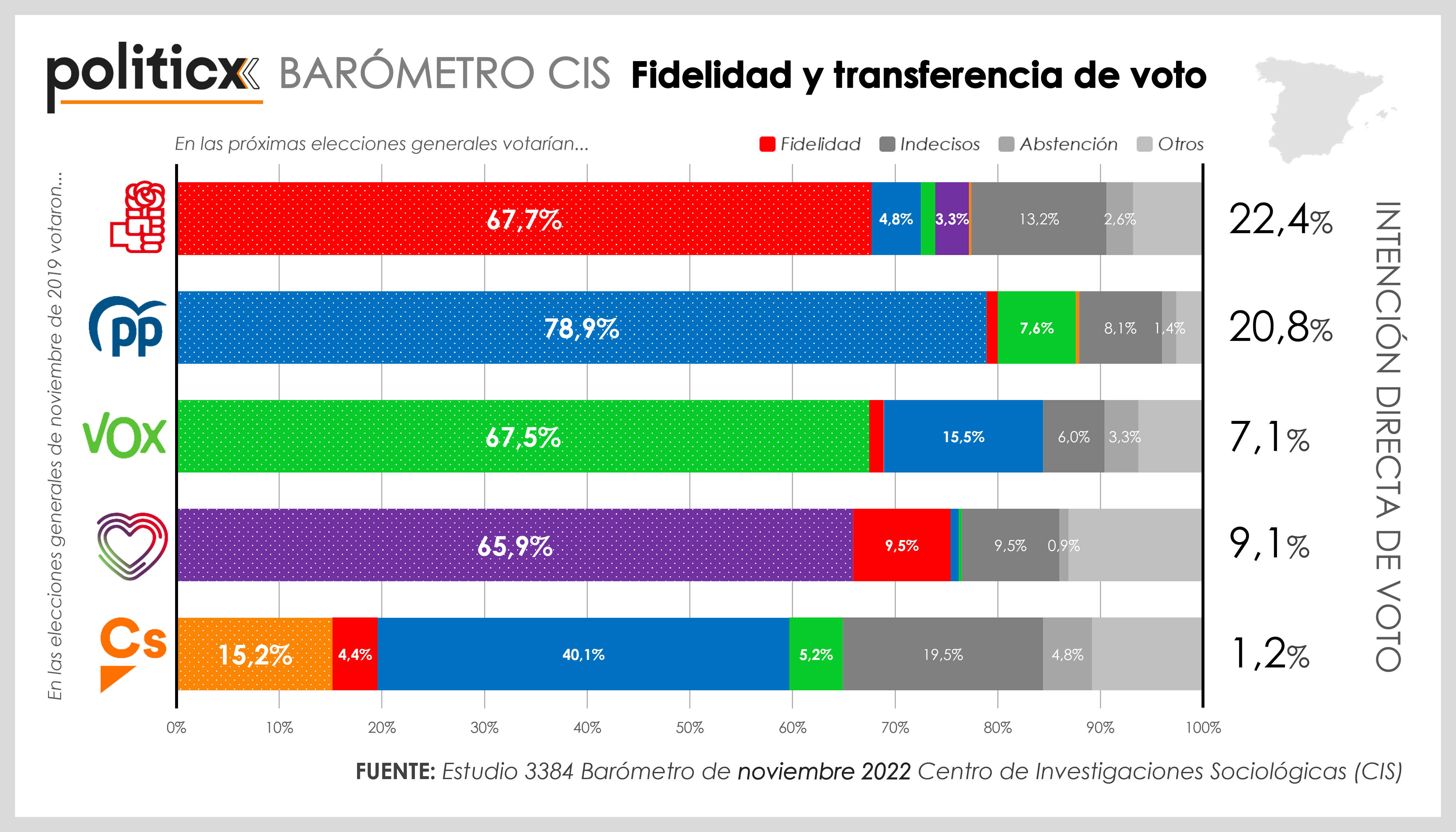 La mayor fidelidad de voto la sigue teniendo el PP (78,9%), aunque baja 4 puntos en el último mes. Las fugas del PSOE hacia el PP vuelven a bajar (-1,7 puntos desde octubre) hasta el 4,8%, aunque siguen más altas que las que había en la etapa de Pablo Casado como líder de los populares. Casi la mitad de los votantes de Ciudadanos en 2019 (40,1%) elegirían hoy al PP. Aunque es el partido en el que más indecisos de cara a votar en unas elecciones generales hay (19,5%). El partido liderado por Inés Arrimadas solo retendría al 15,2% del electorado que obtuvo Cs en 2019 (que ya fue solo el 6,86% a nivel nacional), lo que complica y mucho su supervivencia en la próxima convocatoria, ya que hace muy difícil que logre representación en ninguna circunscripción.