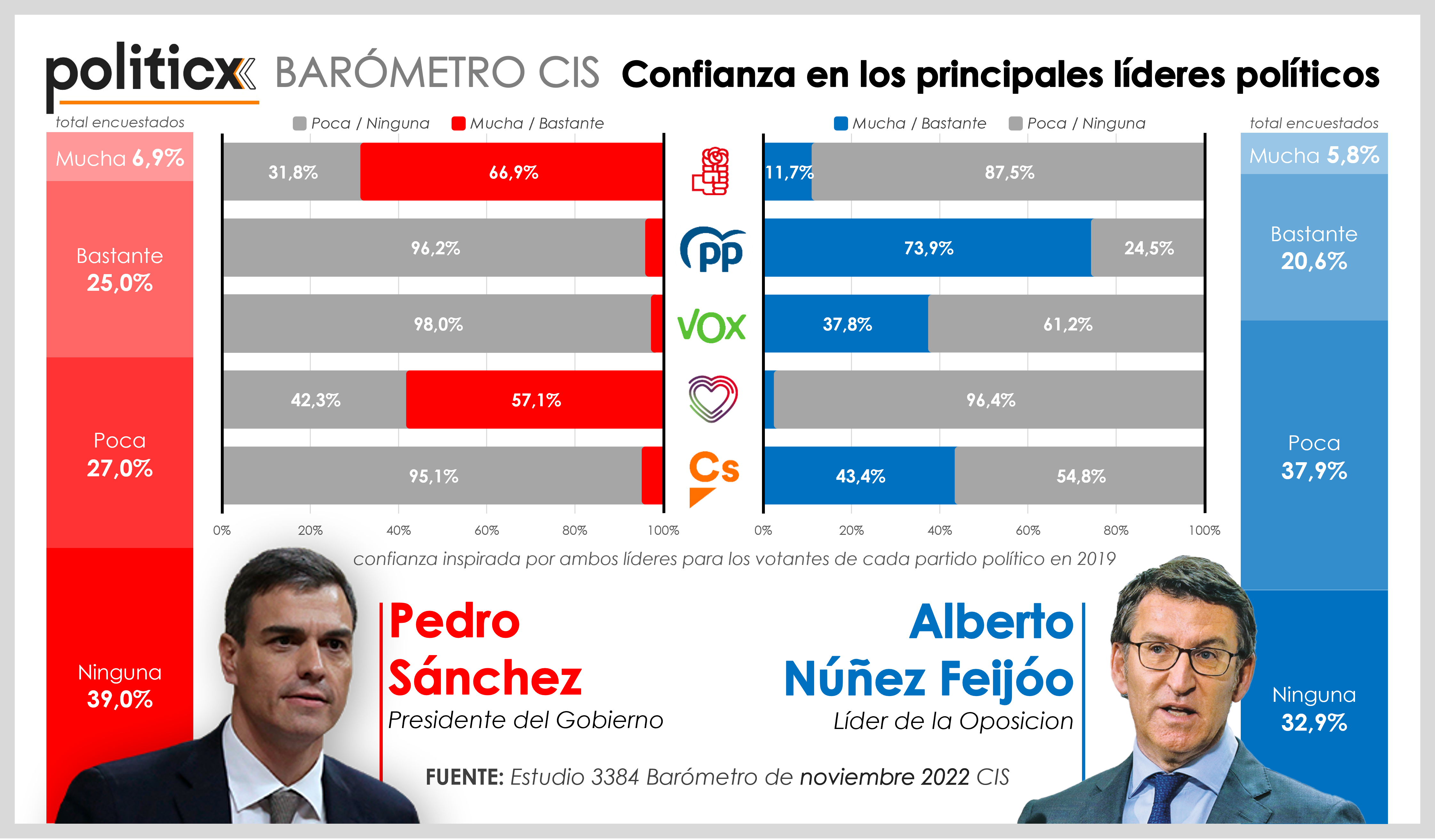 La confianza que inspiran los dos principales líderes se mantiene y no varía prácticamente respecto al mes pasado. Destaca cómo el 31,8% de los votantes socialistas en 2019 tiene poca o ninguna confianza en Sánchez. El dato es menor para Feijóo entre los votantes del PP (solo lo piensa el 24,5%). Además, mientras que el 73,9% del electorado popular tiene mucha o bastante confianza en Feijóo, para el votante del PSOE el dato de mucha o bastante confianza en Sánchez es menor (66,9%).
