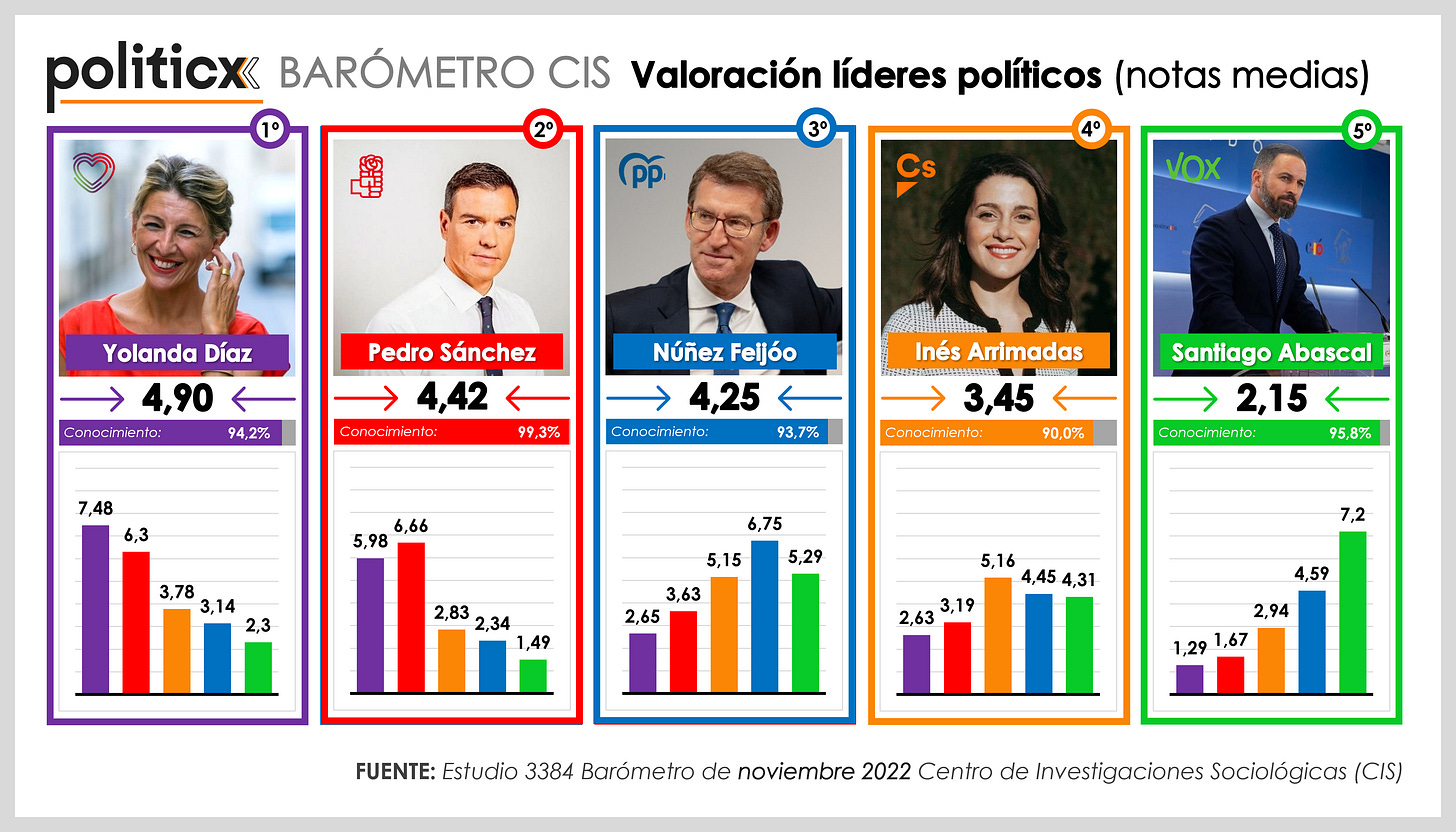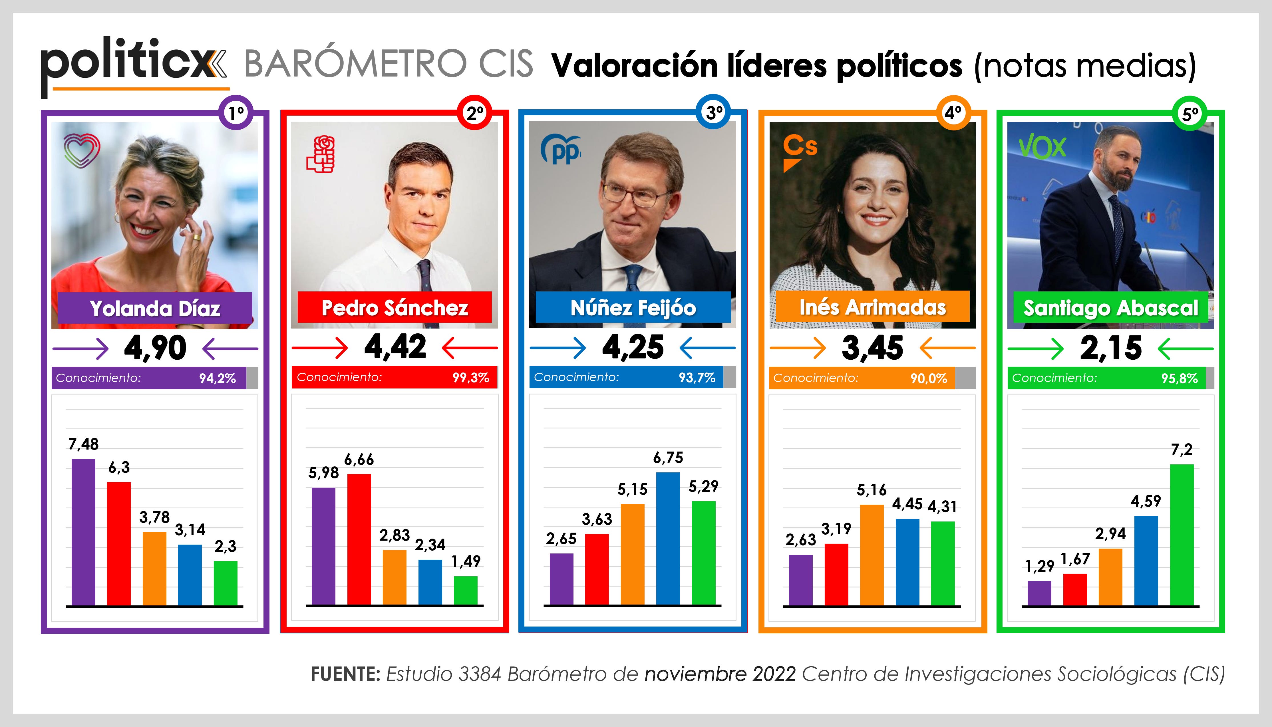 Yolanda Díaz vuelve a mejorar sus datos (+0,19 desde octubre) y sigue siendo la líder mejor valorada con un 4,9 de nota media. Sánchez (4,42) baja (-0,05), pero continúa por delante de Feijóo (4,25) que lo hace más (-0,17). Abascal sigue empeorando mucho su nota (-0,5) hasta un pírrico 2,6. Arrimadas mejora algo su valoración respecto al mes pasado (+0,19), y lo más interesante, después de varios meses logra volver a ser aprobada por los que votaron por Ciudadanos en 2019 (ahora alcanza el 5,16 cuando en octubre se quedó en el 4,99 por parte del electorado de Cs).