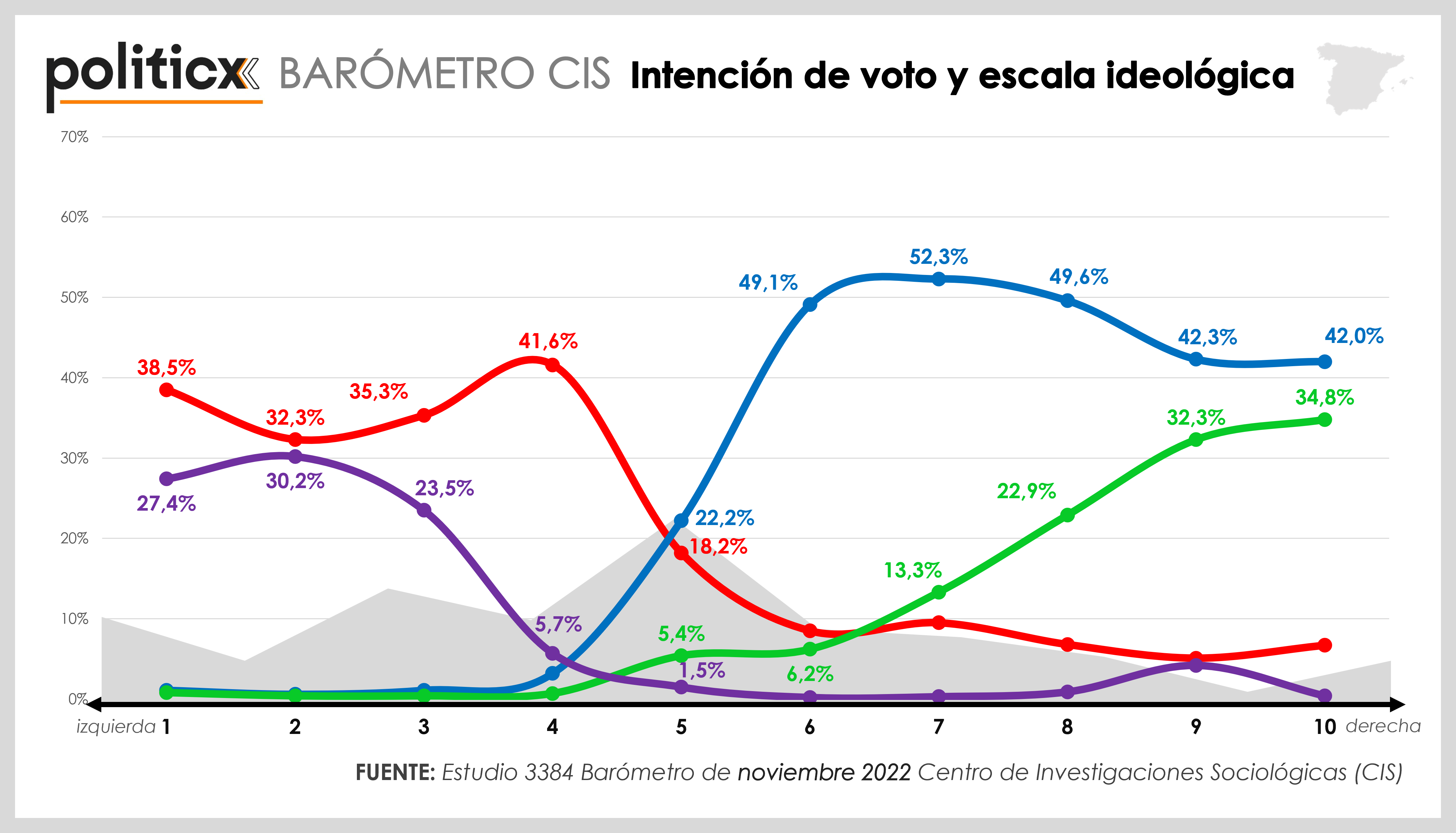 Mientras el PSOE predomina en las posiciones a la izquierda, el PP es el claro ganador entre los encuestados que se ubican a la derecha. Eso sí, en el último mes Vox recupera terreno en la derecha más extremada (posiciones 9 y 10 en la escala) acercándose nuevamente al PP (aunque hubo meses que le superó con creces incluso en la posición 8 con la crisis de liderazgo de los populares). Entre los que se posicionan en el "centro" (5) donde se ubica el grueso del electorado (distribución en gris al fondo del gráfico) gana el PP (22,2%) sobre el PSOE (18,2%) por +4 puntos, aunque los populares caen 2 puntos en esta posición y se reduce su ventaja.