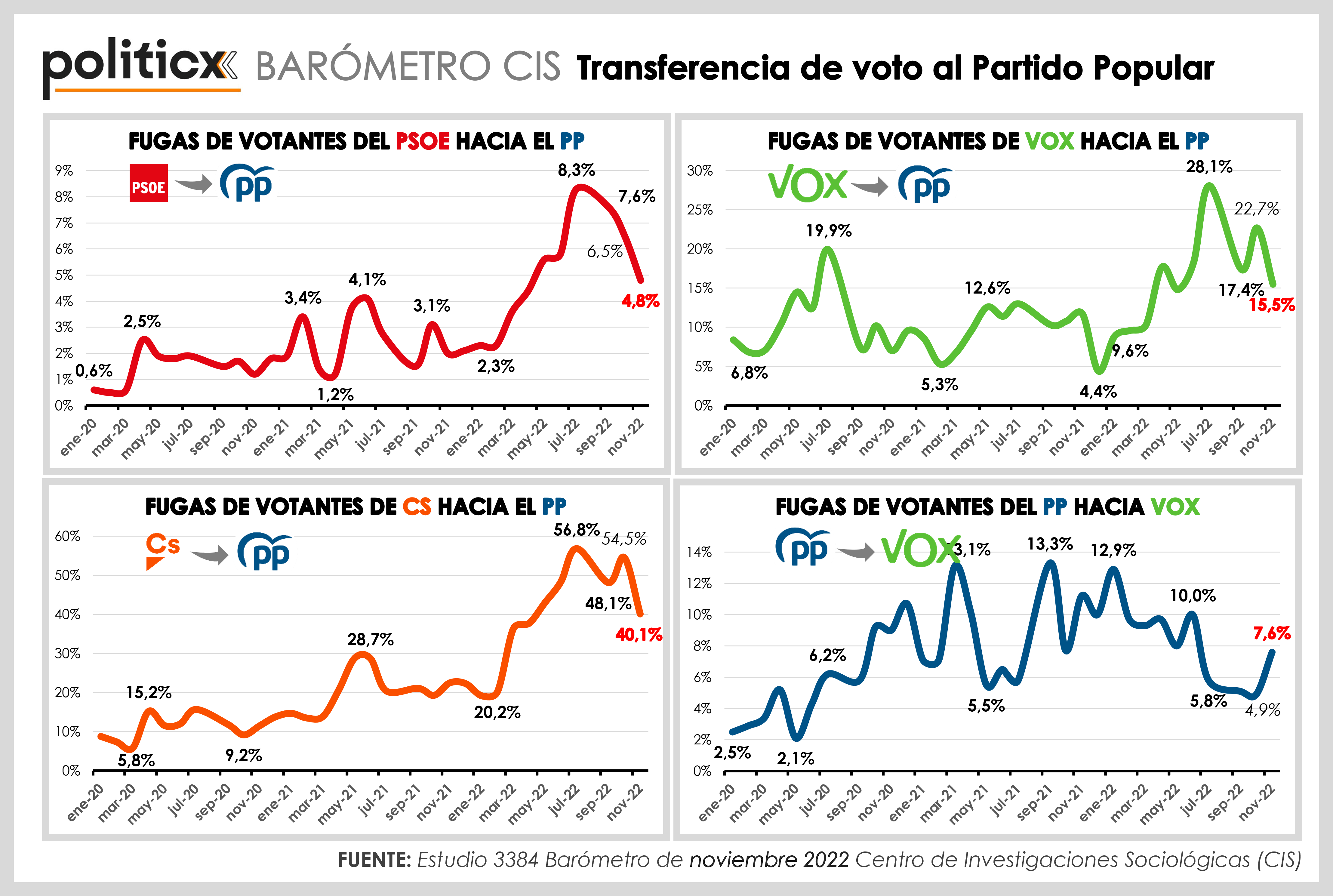 Se puede observa de esta forma la pérdida de fuelle o atractivo de Feijóo y el PP para captar votantes de otros partidos al nivel que llegó en julio en plena luna de miel de su liderazgo. Y no solo eso, en el último mes las fugas de Vox al PP caen mucho: 7,2 puntos (del 22,7% al 15,5%). Y las fugas de Cs al PP disminuyen un total de 14,4 puntos (del 54,5% al 40,1%). Además, las fugas del PP a Vox rompen su tendencia a la baja y vuelven a subir hasta el 7,6% (+2,7 puntos desde octubre).