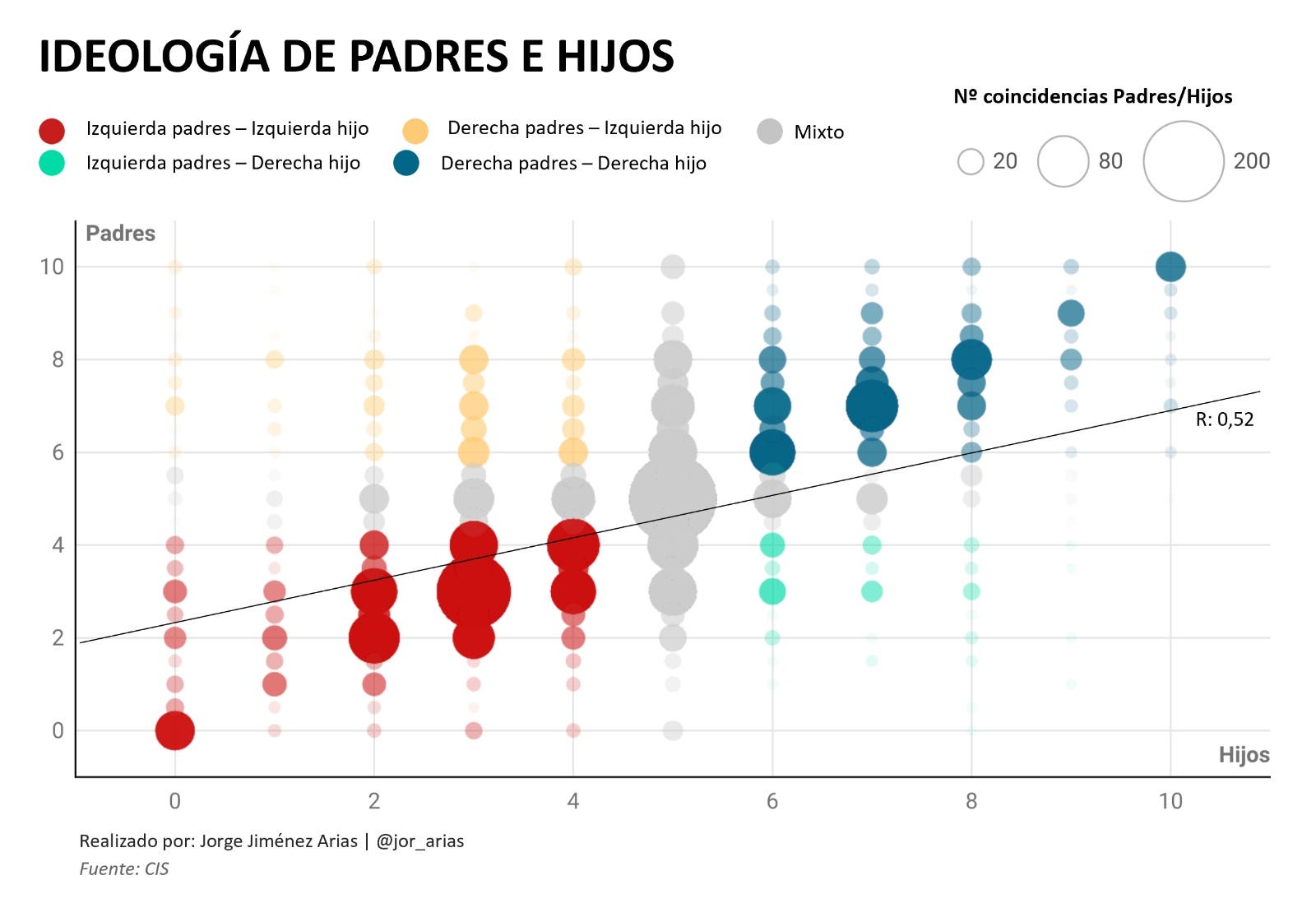 Los datos reflejan una correlación relevante entre la ideología de padres e hijos, de modo que aproximadamente un 30% de la variación en la posición política de los hijos está asociada a la de sus progenitores, mientras que el 70% restante obedece a otros factores. Esto pone de manifiesto que la transmisión ideológica no es un proceso simple ni automático, ya que crecer en un entorno conservador puede incrementar la probabilidad de que un hijo adopte esas ideas, aunque sin que ello suponga un efecto directo.