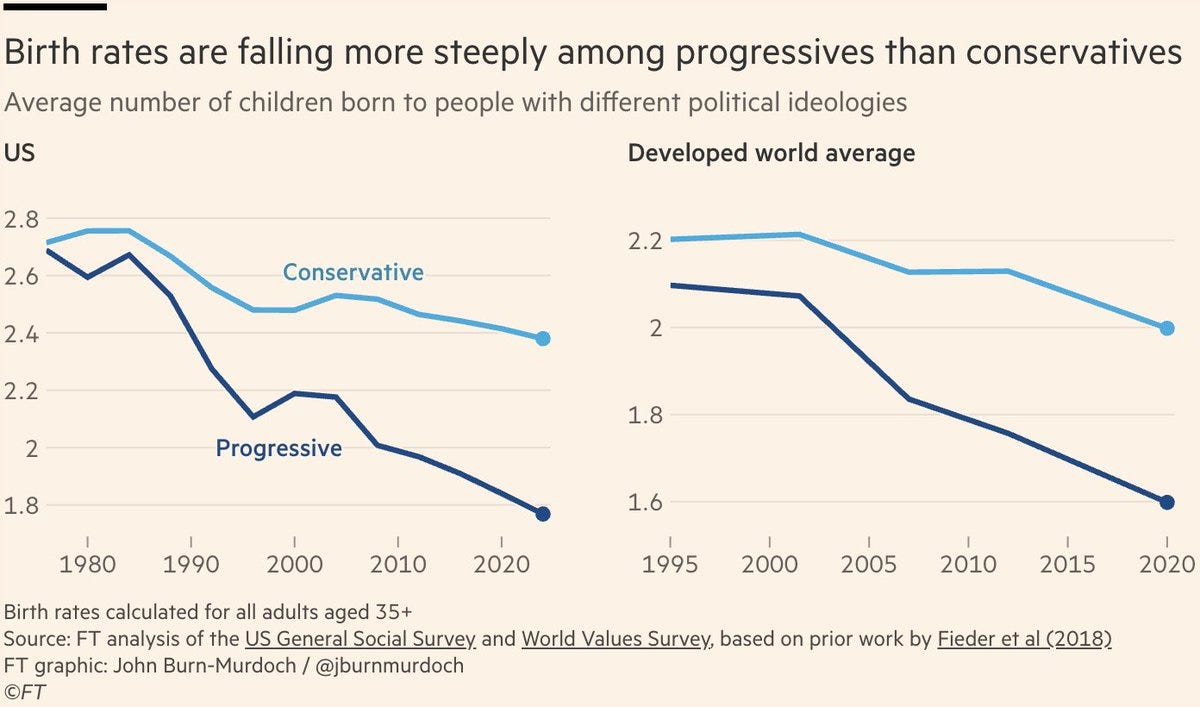 En Estados Unidos, la diferencia en el número de hijos entre conservadores y progresistas nunca había sido tan pronunciada. En 1980 ambos grupos tenían una media similar, alrededor de 2,7 hijos, pero hoy los conservadores se sitúan en torno a 2,4, mientras que los progresistas apenas alcanzan 1,8. Esto supone una brecha del 41% a favor de los primeros. La pregunta es inevitable: ¿puede una diferencia así transformar, poco a poco, el equilibrio político de un país?