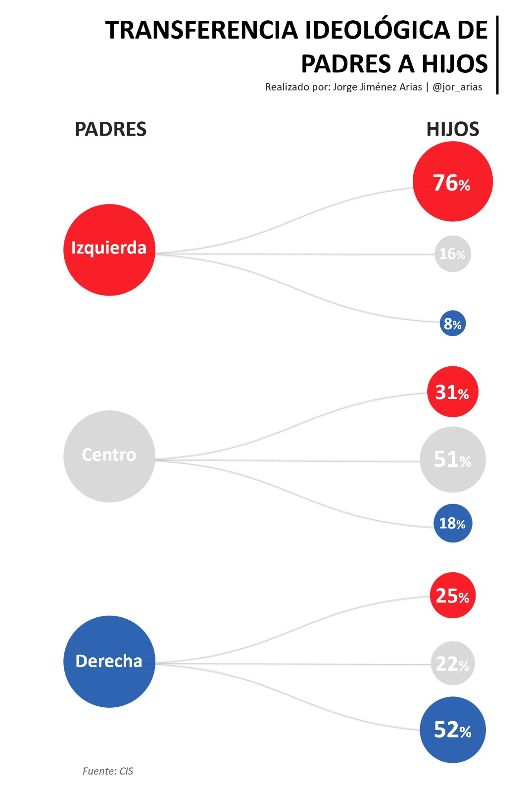 Además, la fidelidad ideológica no es igual en ambos bloques. Los hijos de padres de izquierdas tienden a parecerse mucho más a ellos que los de derechas. Según los datos, un 76% de los hijos de familias de izquierdas mantienen la misma orientación política que sus progenitores, mientras que en el caso de las familias de derechas esta cifra se reduce al 52%. Esto sugiere que la izquierda no solo tiene una base demográfica diferente, sino también una retención intergeneracional más fuerte, mientras que la derecha, pese a tener más hijos de media, “pierde” a una parte importante hacia posiciones más centristas o incluso hacia la izquierda en la siguiente generación.