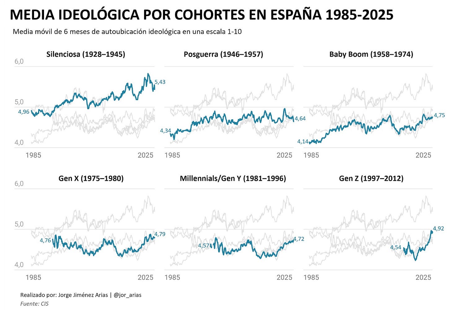 Los baby boomers también muestran una tendencia general hacia la derecha, aunque alrededor de 2015 experimentaron un regreso temporal hacia posiciones más progresistas. Por su parte, la generación X y los millennials son, en conjunto, los grupos más claramente situados en la izquierda del espectro, influidos en buena medida por el contexto político del 15M y sus consecuencias. En cambio, la Generación Z ha protagonizado en los últimos años un giro mucho más acusado hacia la derecha, un fenómeno muy comentado y analizado, en especial por la creciente derechización entre los hombres jóvenes.