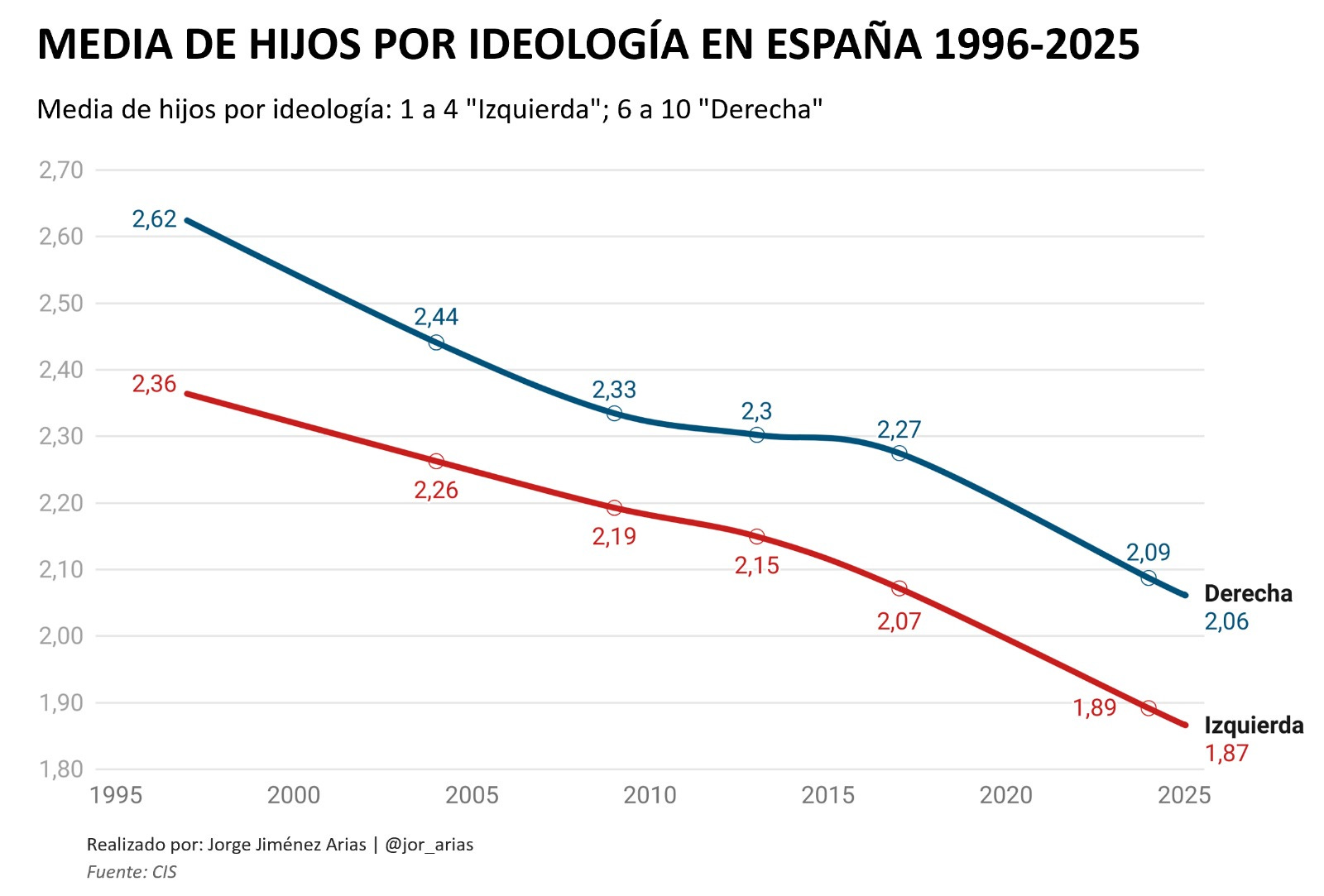 ¿Y qué ocurre en España? Si miramos el histórico del Centro de Investigaciones Sociológicas (CIS), los datos muestran que, durante los últimos 30 años, quienes se sitúan a la derecha han tenido de forma constante más hijos que quienes se identifican con la izquierda. En 1996, la media declarada era de 2,62 hijos entre votantes conservadores frente a 2,36 entre progresistas. Casi tres décadas después, en 2025, la fecundidad ha caído en ambos bloques, pero la diferencia se mantiene: 2,06 frente a 1,87, lo que supone un 10% más a favor de la derecha. ¿Puede esa ventaja numérica traducirse en un cambio político a largo plazo?