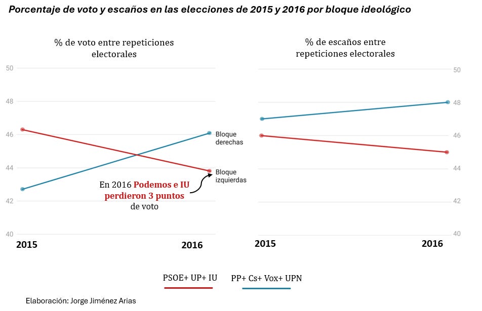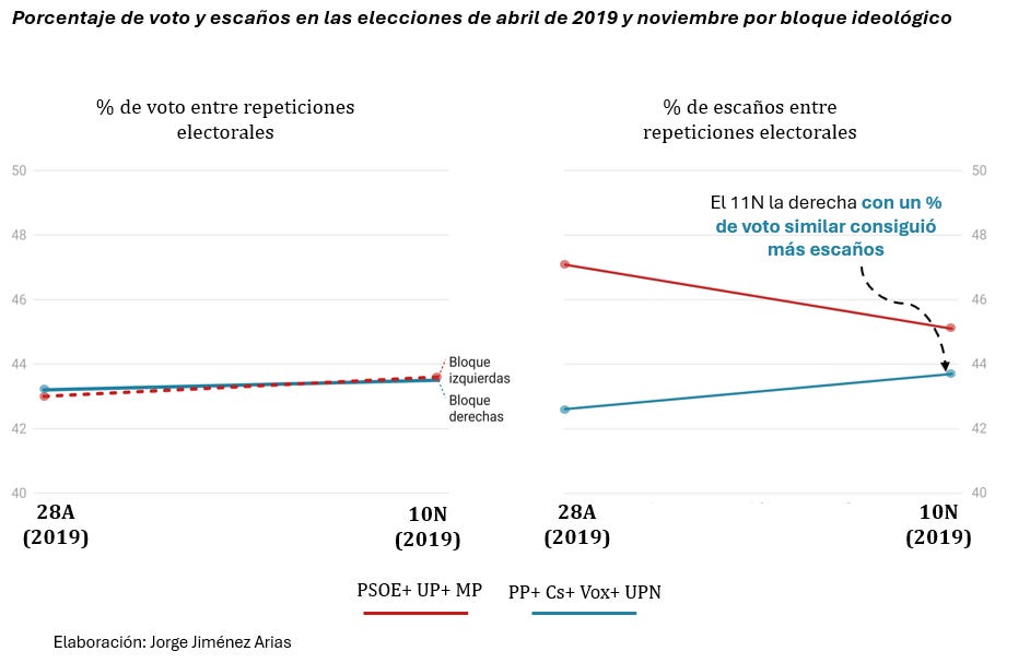 Sin embargo, el caso más particular lo representa la repetición electoral de noviembre de 2019, en la que a pesar de que ambos bloques mantuvieron un porcentaje parecido de voto, la traducción en escaños fue mucho más favorable para la derecha en los segundos comicios. Esto se debió principalmente al voto estratégico de parte de la derecha que dejó de votar a Ciudadanos, maximizando las posibilidades de conseguir escaños de PP y Vox.