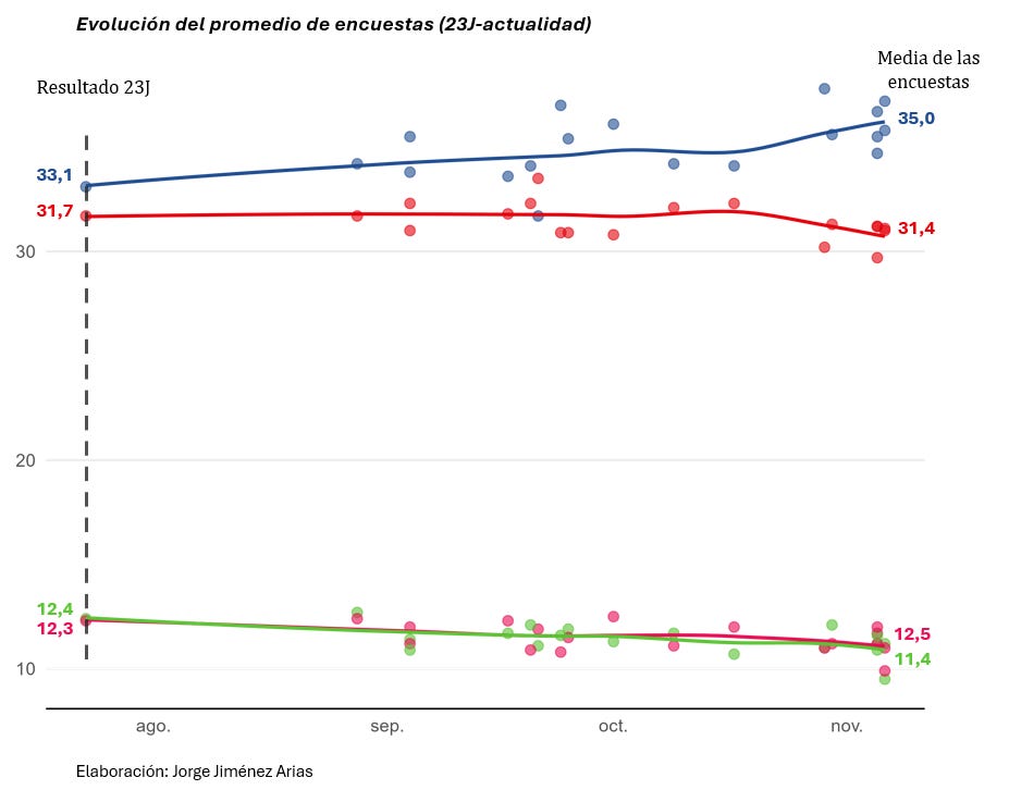 ¿Qué nos revelan los sondeos actuales? Las encuestas reflejan una dinámica de empate entre las coaliciones similar al escenario del 23J, con un PSOE en leve declive y un incremento moderado del PP. Mientras, por la parte baja, Vox y Sumar experimentan cierto retroceso del que probablemente se estén nutriendo los partidos grandes. Esto dibuja un escenario incierto en el que unas segundas elecciones puede suponer lanzar una moneda al aire que puede caer en favor de cualquier bloque.
