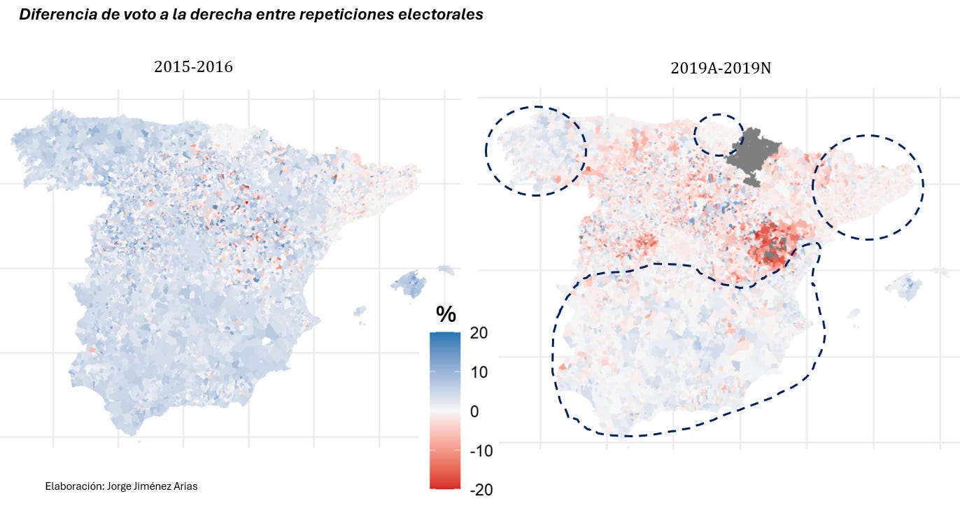 Aterrizando sobre la arena electoral, ambas repeticiones de elecciones nos muestran como la derecha avanza más en aquellos territorios en los que el PSOE tuvo un buen resultado el 23J. Mientras que en las repetición de 2016 la derecha mejoró de forma generalizada en todo el territorio, en 2019 consiguió mantenerse en País Vasco y Cataluña, y mejoró en Galicia y en todo el sur y este de España. Todas estas son provincias y comunidades autónomas en las que de producirse ligeros cambios de voto en una repetición electoral, la balanza podría inclinarse en favor de la derecha, que el 23 de julio quedó a tan solo 4 escaños de la mayoría absoluta.