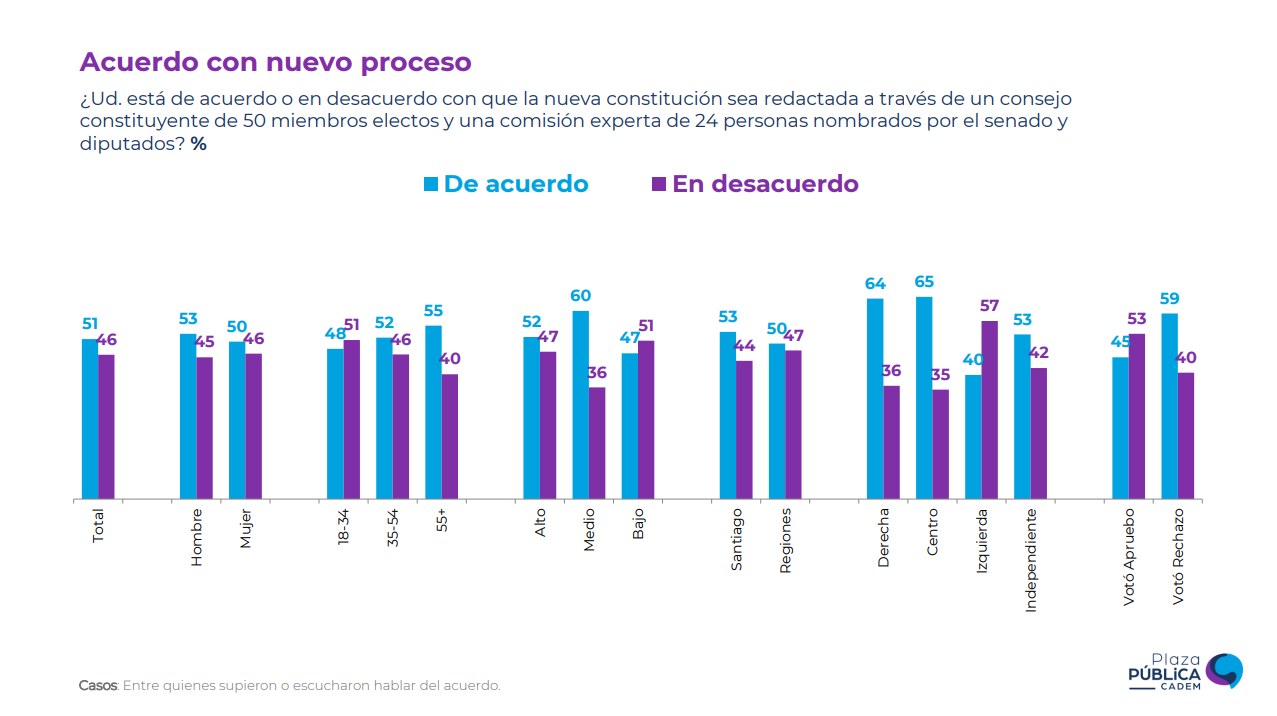 En relación con los perfiles sociodemográficos, los que más respaldan el acuerdo se identifican con el centro (65%) y la derecha (64%), mayores de 55 años (55%), de clase media (60%) y en el anterior plebiscito votaron por el “Rechazo” (59%). En tanto, los que se encuentran más en desacuerdo se ubican en la izquierda (57%), jóvenes (51%) y votaron apruebo en el referéndum (51%).